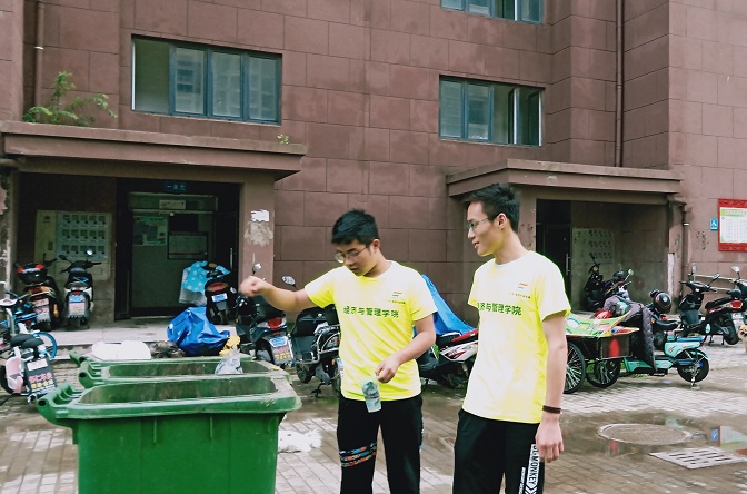 到达蚌埠站,火车站的人流一如既往。志愿者分成两波,顺着蚌埠站周围的街道四散开来,寻找环卫工人。转了一两条街,两边的志愿者都找到了正在工作的环卫工人。一边志愿者上前说明来意,环卫工人笑着同意了志愿者的青请求,将手中的扫帚和簸箕,递给了志愿者。志愿者先为环卫工人送上买好的矿泉水,后一边清扫着垃圾,一边与他交流,了解到:近些年蚌埠市环境卫生情况已经改善了很多,但要实现垃圾分类还有一定的距离,因为在蚌埠,垃圾分类的宣传范围不是很广泛,做的准备也不够充足,真正实施还要一段很长的时间。环卫工人发现志愿者拿扫帚的姿势有些错误,还为志愿者做出演示,告诉志愿者扫帚的使用方法,这一幕也在另一边上演着。