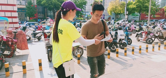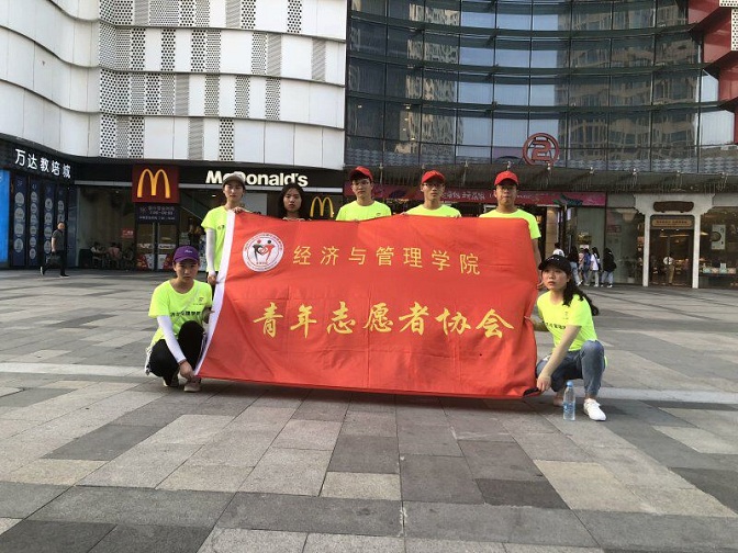 2019年7月5日,经济与管理学院青年志愿者协会暑期社会实践团队在万达广场发放传单,进行垃圾分类的宣传活动。
