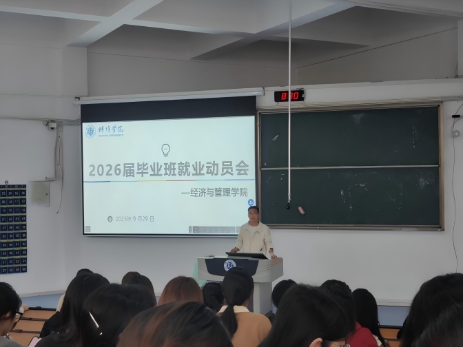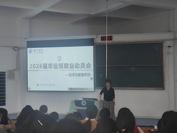 秋风送爽,硕果盈枝。为使2026届毕业生精准把握就业脉搏,明晰职业规划,经济与管理学院于9月26日、29日召开“经世致用 策马新程”2026届毕业生就业动员大会,大会由毕业班辅导员蔡德洪、何书贤主持,学院党委书记赵睿、副书记夏晓燕、毕业班辅导员及全体2026届毕业生齐聚一堂,共同吹响迈向新征程的号角。