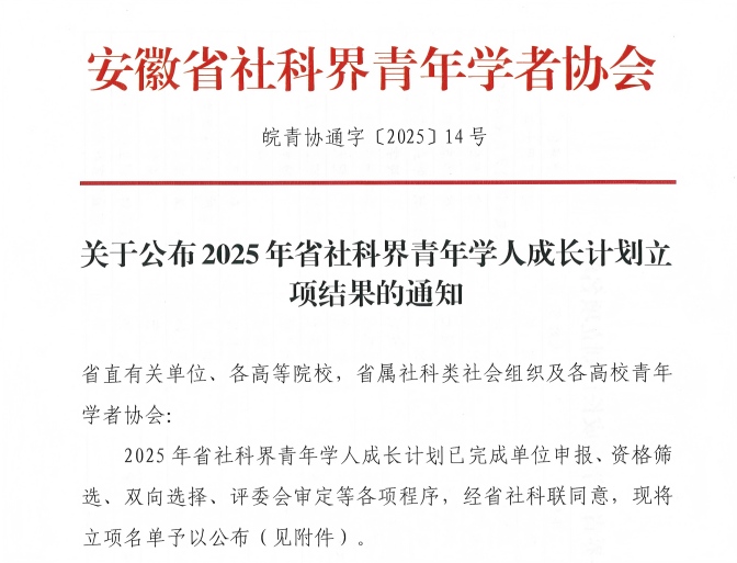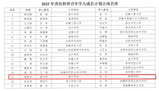 近日,安徽省社科界青年学者协会正式公布了2025年“省社科界青年学人成长计划”立项结果,我校经济与管理学院青年教师徐艺博士成功入选,实现了我校在该项目上的突破。