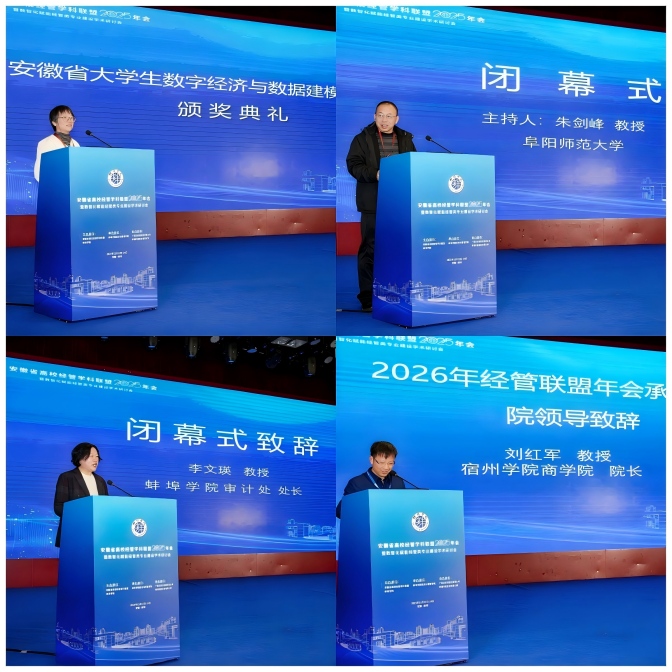 蚌埠学院审计处处长李文瑛教授代表承办单位致闭幕辞。她向所有参会嘉宾、工作人员及志愿者表示衷心感谢。宿州学院商学院院长刘红军教授作为联盟成员单位代表致辞。他指出,此次年会汇聚智慧、凝聚共识,特别是在数智化转型路径、协同育人机制等方面形成了诸多有价值的思想成果。他倡议各成员单位以此次会议为起点,保持密切沟通,将论坛上探讨的合作意向转化为具体项目与实际行动,携手推动安徽经管教育整体水平提升。闭幕式同时进行了“安徽省大学生数字经济与数据建模创新大赛”的颁奖。