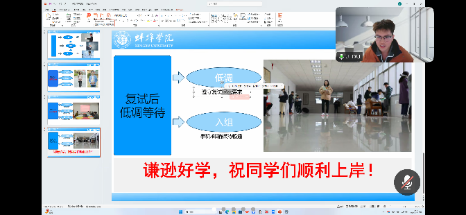 辅导环节中,杜建辉博士围绕复试全流程进行系统讲解。他建议复试英语使用简单词汇和基础句型,确保表达流畅准确;笔试需依托复习资料扎实备考,遇题型变化沉着应对,并指出面试权重高,可弥补笔试短板;复试后严格遵守保密要求,保持低调等待。罗梦勤结合自身调剂上岸经验,详细指导调剂各环节,充分把握“黄金48小时”,科学填报平行志愿,巧用备注栏突出六级、获奖、科研等优势等。专题辅导历时两小时,两位嘉宾的分享兼具宏观策略与实操细节,内容详实、针对性强,为学子提供清晰备考指南,助力顺利“上岸”。